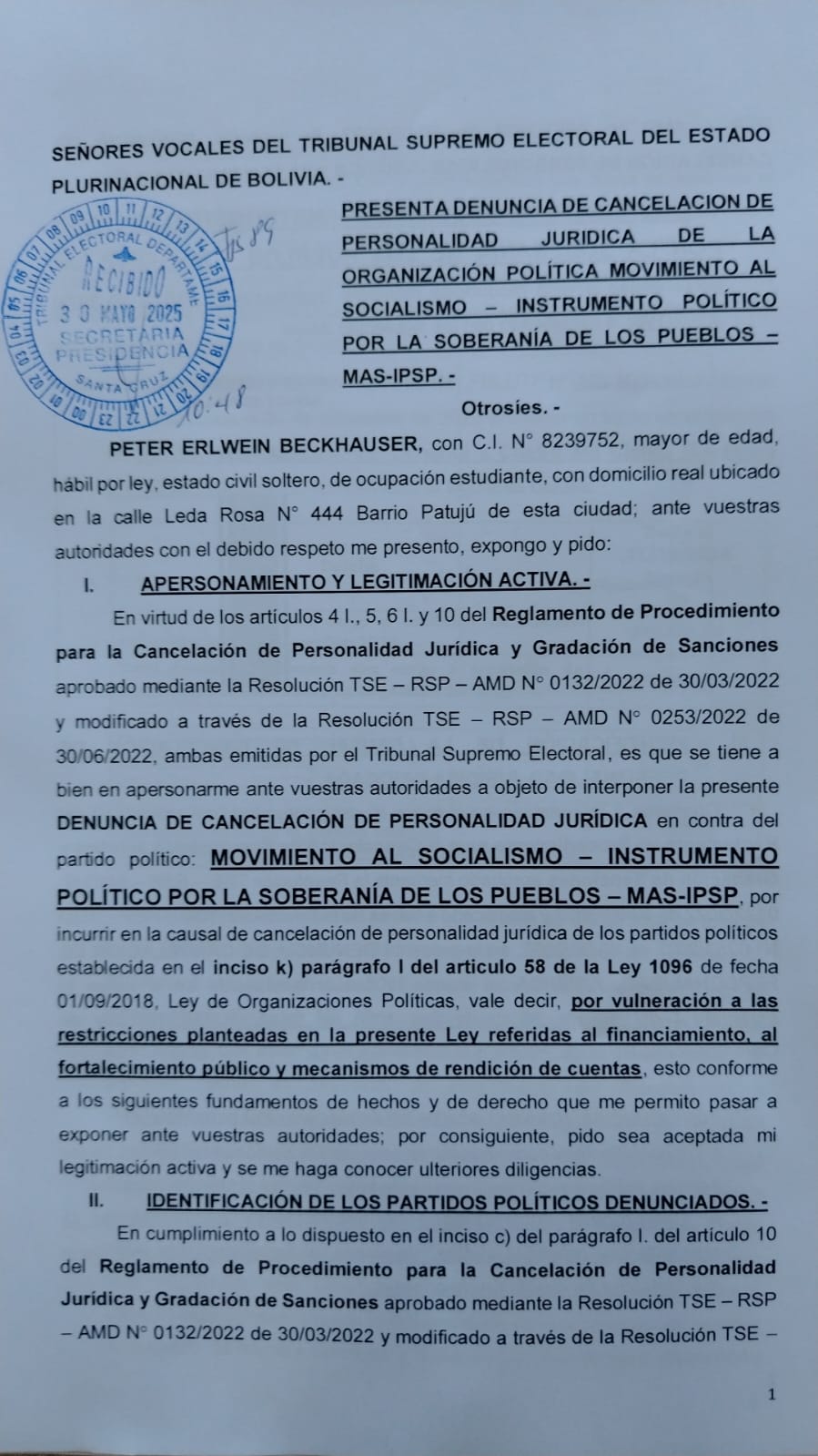 “Denuncia de cancelación de personalidad jurídica en contra del partido político: Movimiento Al Socialismo”, señala una parte del memorial presentado por Beckhauser, que tiene como fecha de recibido este viernes 30 de mayo.