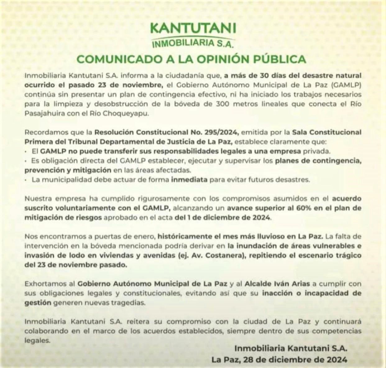 "Exhortamos al Gobierno Autónomo Municipal de La Paz y al alcalde Iván Arias a cumplir sus obligaciones legales y constitucional, evitando así que su inacción o incapacidad de gestión generen nuevas tragedias", señala el comunicado de Kantutani, cuyos principales accionistas se encuentran con medidas sustitutivas en Lima, Perú.