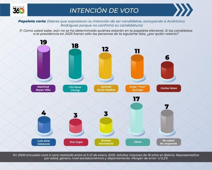 • Manfred Reyes Villa lidera con un 19% de intención de voto, consolidándose como el candidato más fuerte entre los que han confirmado su interés. • Chi Hyun Chung se posiciona en segundo lugar con un 18%, demostrando su capacidad de atraer una base significativa de apoyo. • Samuel Doria Medina (12%) y Jorge “Tuto” Quiroga (11%) se mantienen como figuras relevantes pero con menor respaldo.